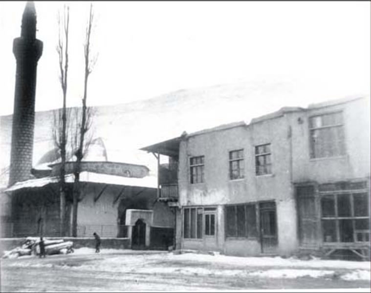 1950’ler – Ümmet Baba Camii. Bir kış günü. Çocuklar odun mu çekiyor yoksa oynuyorlar mı belli değil. Elektrik direkleri görünmediği için fotoğraf 1955’lerden önce çekilmiş olsa gerek.