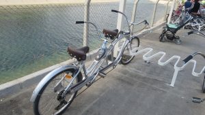 Klasik iki tekerlekli bisikletlerin çift kişilik olanlarına tandem bisiklet deniyor. Her iki yolcu pedal çevirerek hareketi sağlıyor bu tarz bisikletlerde. Parkurda birkaç çeşit tandem bisiklet gördüm. Bazı modellerinde her iki yolcu için bardak koyma bölmeleri vardı. Bir diğerinde arka koltuğun önünde küçük çocuklar için üçüncü bir pedalsız koltuk gördüm. Çiftler ve küçük çocuklu üç kişilik aileler için uygun. İki kişi nasıl dengeyi sağyacağız diye kaygılanmaya gerek yok. Eşim ve çocuğumla birlikte çok keyifli sürüş yapabildik.
